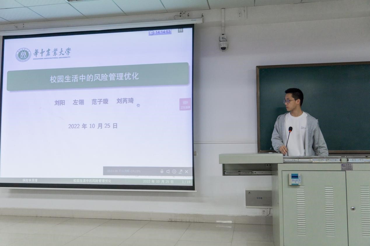 聚焦校园生活风险,将生活与专业知识相融合。来自“保险集团五公主”的袁娟分别从校园内的学习工作、人际关系、室内活动、户外活动、其余偶发风险五个方面给我们介绍了近百种风险,事无巨细,同学们在大开眼界的同时,也更加深刻了解了校园内每个“角落”存在的风险。来自另一小组的刘阳则根据所学保险学原理的知识,对于这些风险提出了具体的风险管理优化的措施,并估计了相应成本。在给大家形象地讲述了校园风险的同时,也帮同学们深化巩固了所学知识,真正做到了“学有所获,学有所用”。