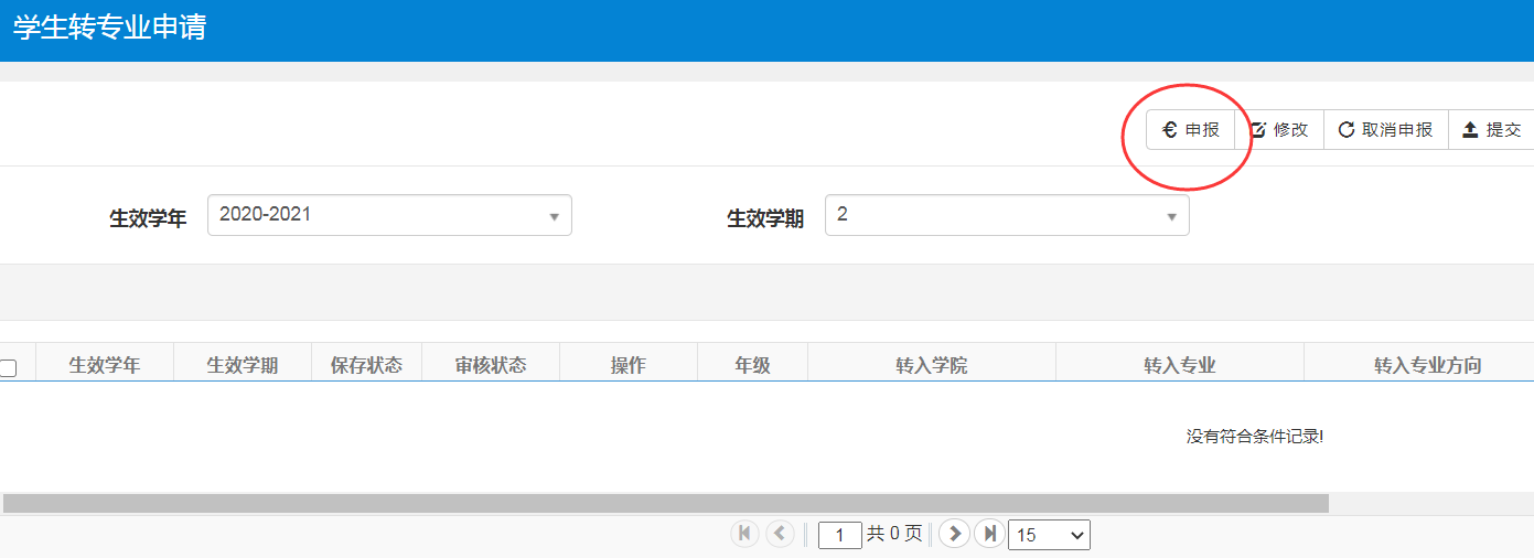 2.点击“申报”,进入转专业申请界面,选择转入公司和专业,上传附件材料,填写理由,点击 “提交申请”。(因特殊原因申请转专业需提供相关附件材料。)