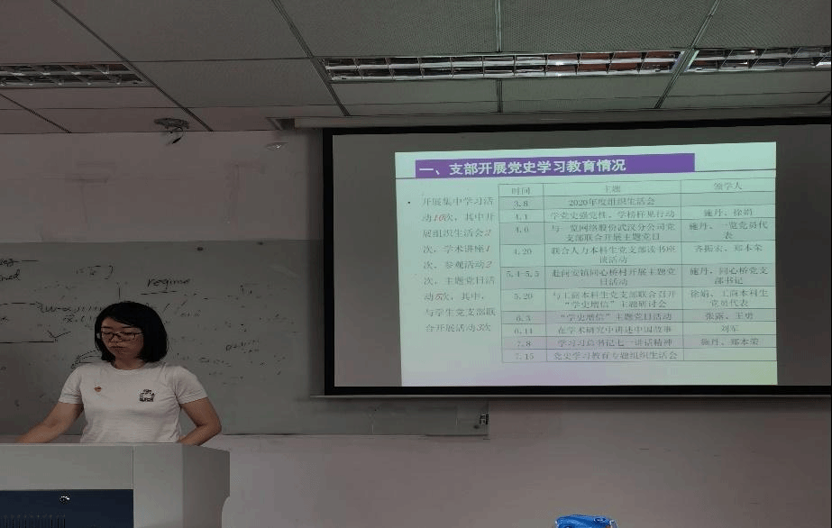 活动伊始,党支部书记施丹向大家汇报支部半年来开展党史学习教育情况,支部共举办集中学习活动10次,其中,组织生活会2次、学术讲座1次、参观考察2次、主题党日活动5次,为了增进师生交流,与员工党支部联合开展活动3次。围绕学党史、悟思想、办实事、开新局主题,依托2020年立项的校级党建工作对标争先项目,支部开展了形式多样、内容丰富的学习活动,通过走出去与引进来相结合的方式,不断丰富党史学习教育形式;邀请中国人民大学刘军老师讲授如何讲好中国故事,拓展党员教师科研视野;支部还充分发挥党员先锋模范作用,助力枝江市问安镇同心桥村美丽乡村建设。但是,支部党建活动也存在一些不足,如学习活动的纪律性有待加强,学习形式和服务师生方式有待进一步创新,学习效果有待进一步保障。这都是下半年党建工作亟需改进的地方。