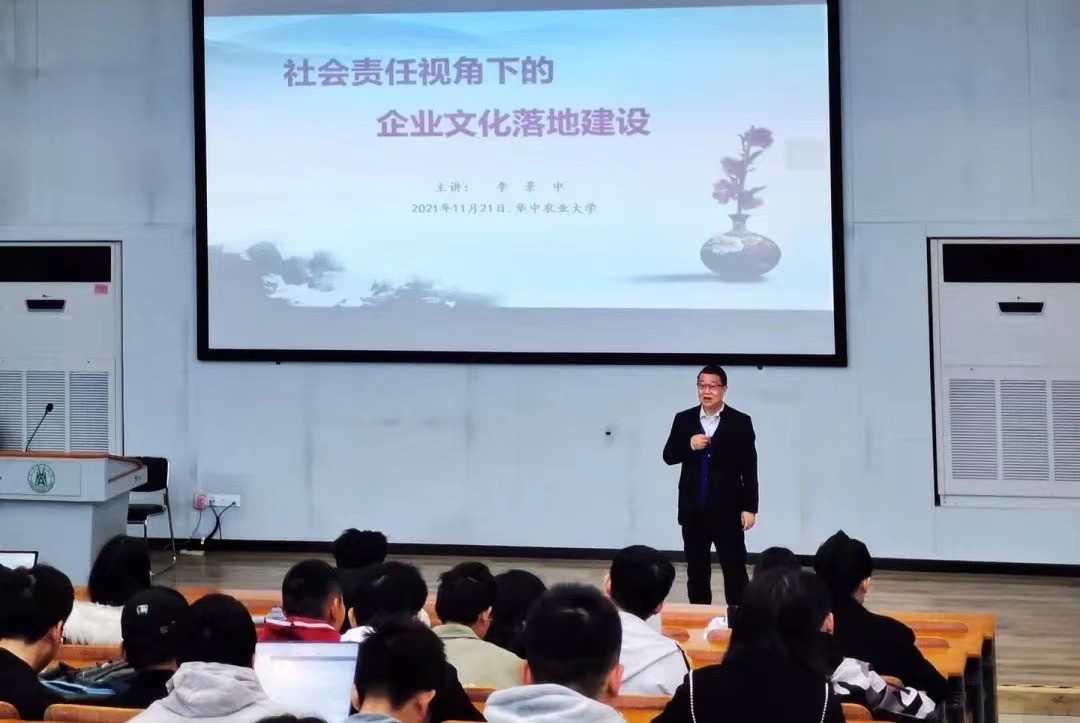 2021年11月21日下午,在三教学楼S2报告厅现任武汉市国资委市管正职领导干部、原武汉农业集团党委书记、董事长李景中老师受邀为21级专业硕士研究生作题为《社会责任视角下的企业文化落地建设》的主题报告。