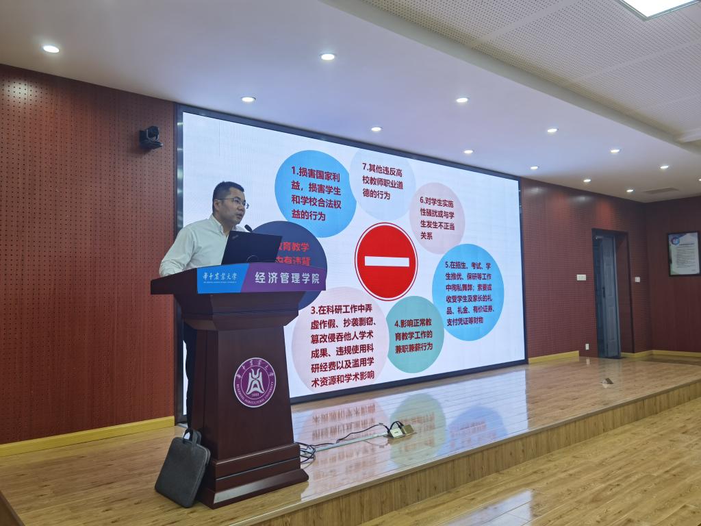 公司经理李谷成以“以德立身 以德立学 以德施教 以德育德”为主题,从习近平总书记关于师德师风的重要论述、高校教师师德要求、高校教师师德失范案例、在立德树人过程中如何做等四个方面作师德师风专题报告。他带领教职工重温了《关于建立健全高校师德建设长效机制的意见》中明确的师德禁行行为“红七条”以及《新时代高校教师职业行为十项准则》《研究生导师指导行为准则》等师德规范,通报了2022年8月以来教育部公开曝光的21起违反教师职业行为十项准则典型案例,开展师德警示教育。