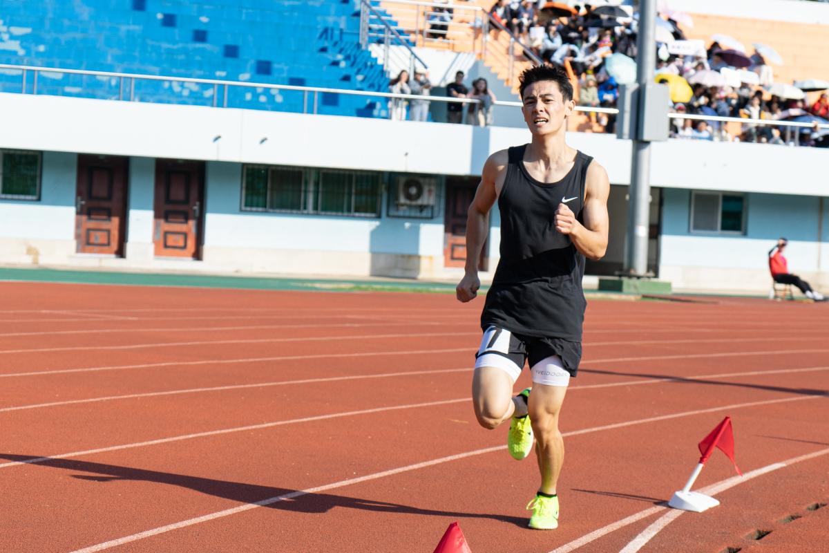 男子4x100m第一组第一名经管员工周听然冲线(丁沐嵘 摄)