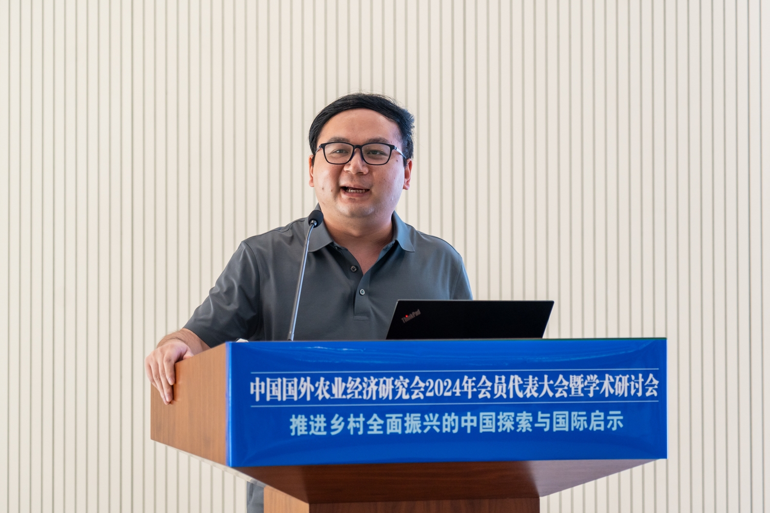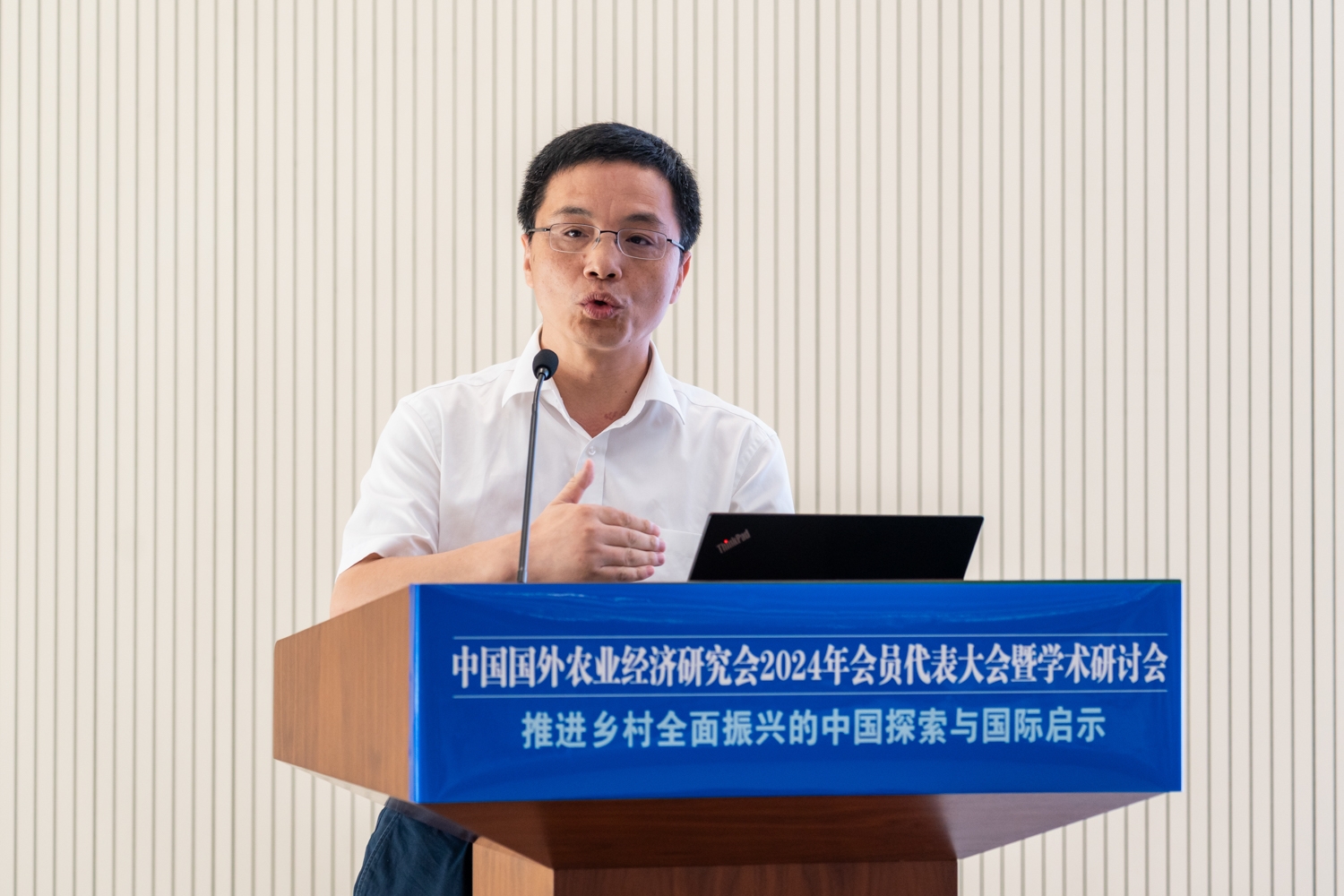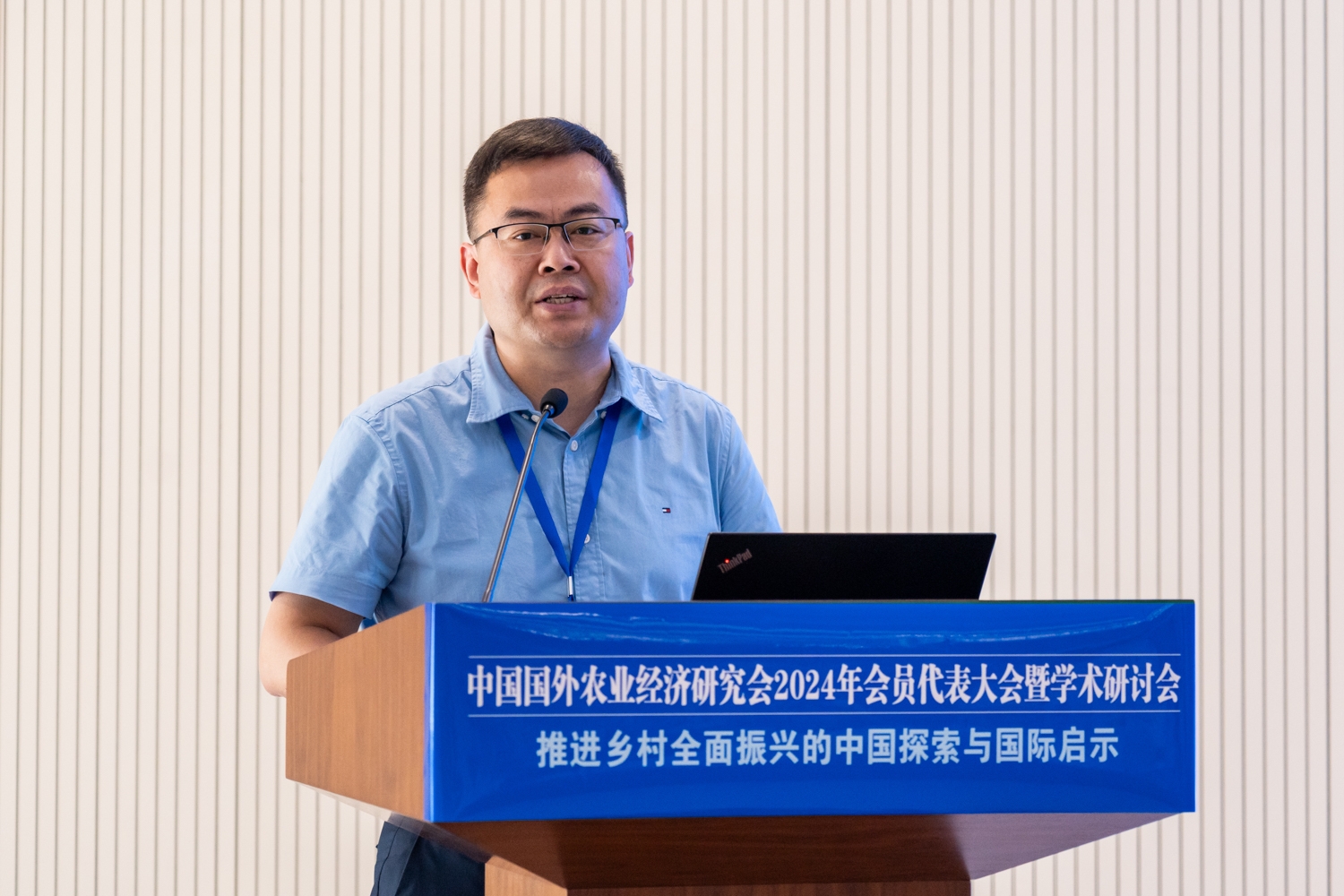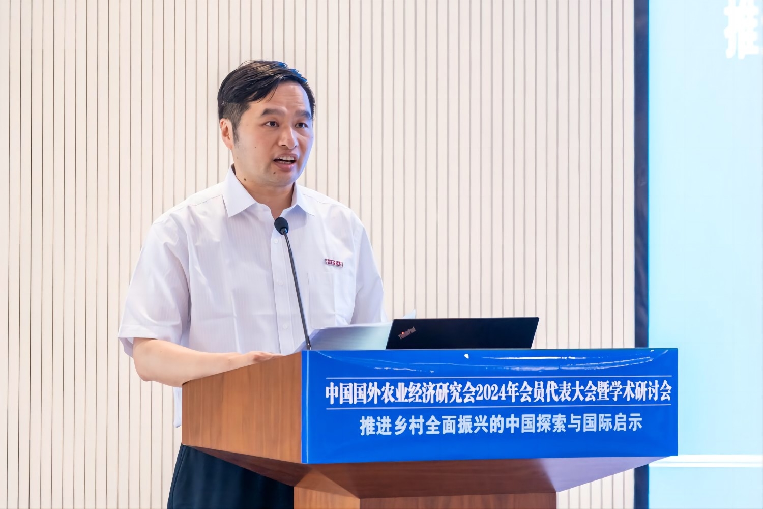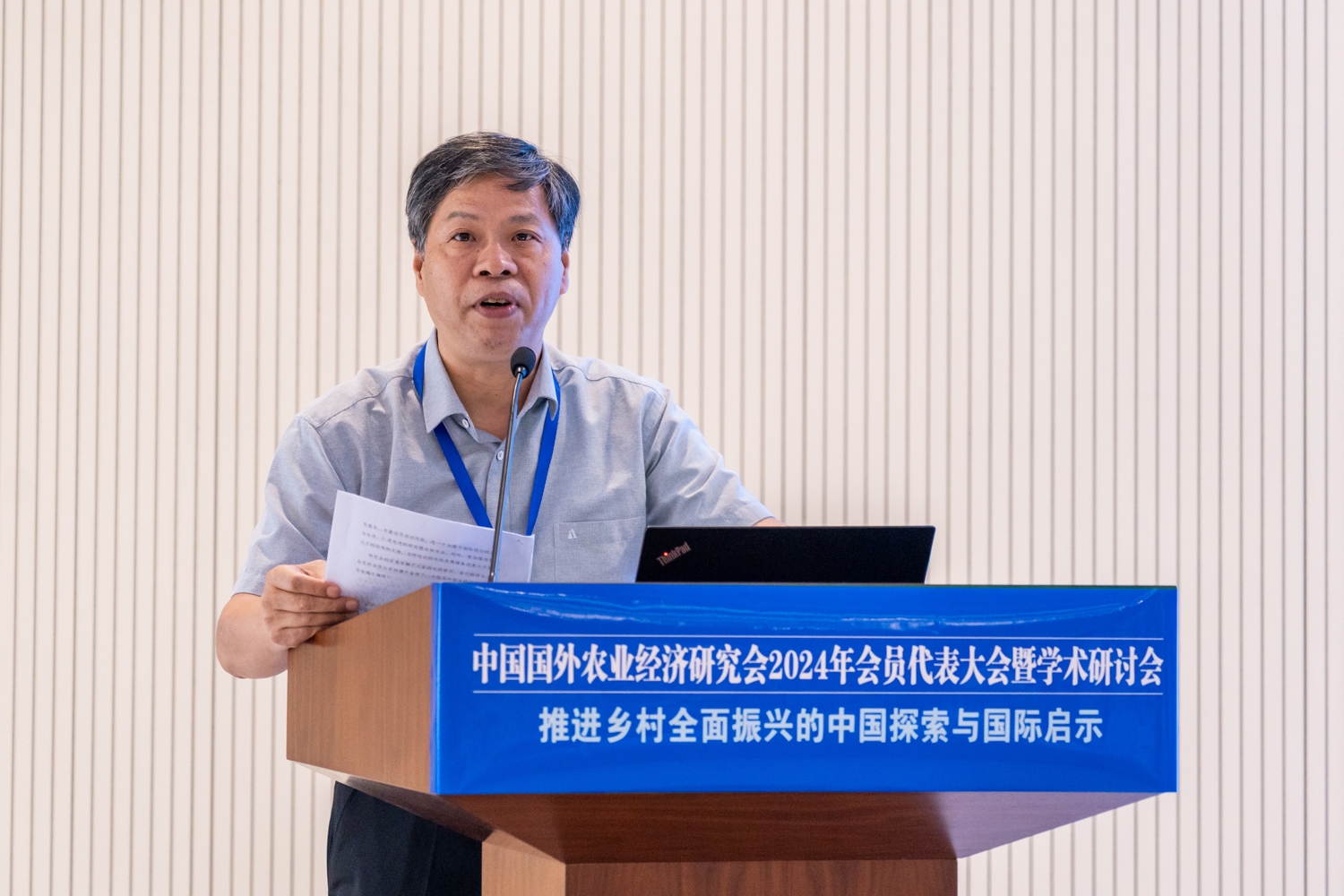 中国国外农业经济研究会秘书长胡冰川作第八届理事会工作报告(学通社记者 韩鑫垚 摄)