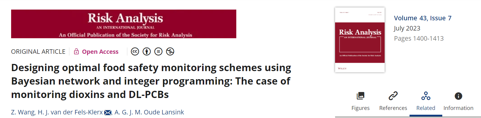 近期,公司王正聪副教授与荷兰瓦赫宁恩大学H. J. van der Fels-Klerx和A. G. J. M. Oude Lansink教授在风险管理领域权威期刊“Risk Analysis”发表了题为 “Designing optimal food safety monitoring schemes using Bayesian network and integer programming: The case of monitoring dioxins and DL-PCBs”( 论文链接:https://doi.org/10.1111/risa.14030)的研究论文。该研究得到bv伟德国际1946自主科技创新基金(2662022ZKQD003)和荷兰瓦赫宁根食品安全研究中心的资助。