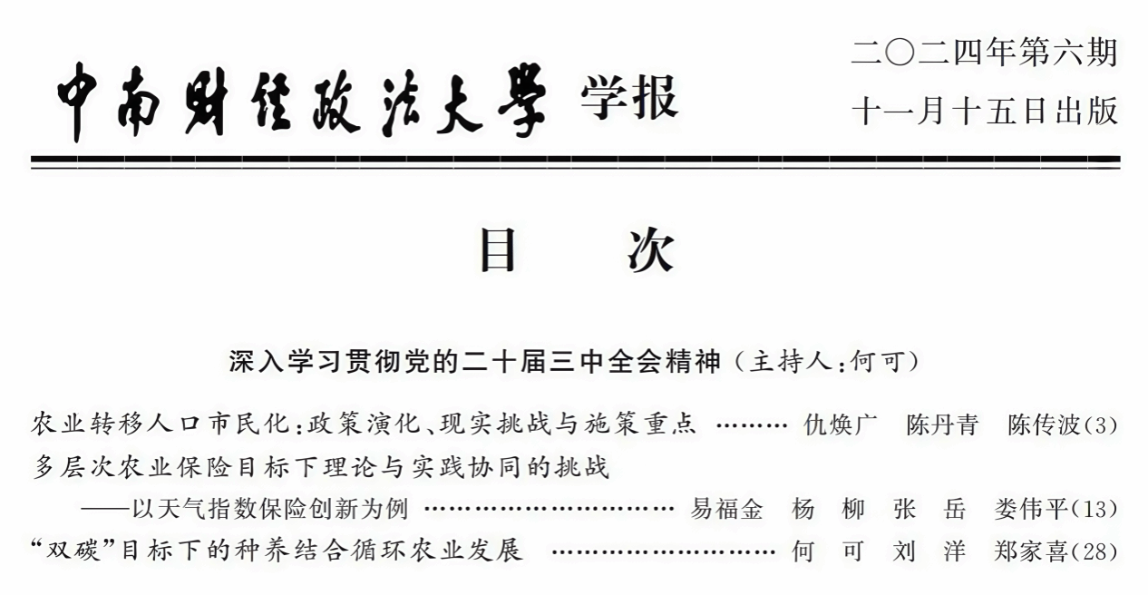 为深入学习贯彻党的二十届三中全会精神,《中南财经政法大学学报》联合bv伟德国际1946农业绿色低碳发展实验室,特邀教育部“青年长江学者”、实验室主任何可教授主持“深入学习贯彻二十届三中全会精神”专题,约请辽宁大学副董事长、教育部“长江学者”特聘教授仇焕广教授,以及国家“万人计划”哲学社会科学领军人才、浙江大学农业风险管理与安全发展研究中心主任易福金教授,共同探讨新时代“三农”工作的重点与发展方向。相关研究成果已发表在《中南财经政法大学学报》2024年第6期。