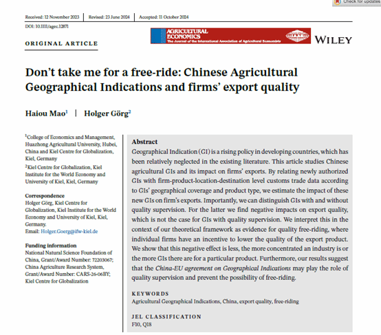 近日,公司毛海欧副教授与德国基尔世界经济研究所Holger Görg教授在国际农经学会会刊Agricultural Economics发表题为“Don’t take me for a free-ride: Chinese Agricultural Geographical Indications and firms’ export quality”的论文。