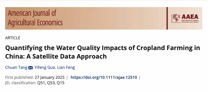 近日,公司唐川副教授及合作者的研究论文 "Quantifying the Water Quality Impacts of Cropland Farming in China: A Satellite Data Approach" 在国际农业经济管理重要期刊American Journal of Agricultural Economics 发表。该研究运用卫星遥感数据,首次从经济学视角量化分析了中国耕地利用对水环境质量的影响,为制定精准的农业面源污染治理政策提供了实证依据。