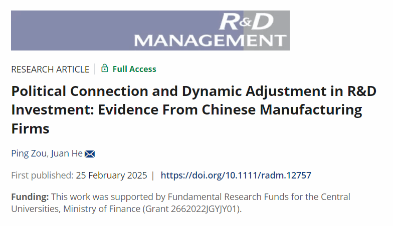 公司会计系邹萍副教授和经济学系贺娟副教授近期在“R&D Management”合作发表论文“Political Connection and Dynamic Adjustment in R&D Investment: Evidence From Chinese Manufacturing Firms”。“R&D Management”属于JCR社科类一区SSCI期刊,五年影响因子7.1,ABS 3星期刊。该研究受到公司自主科技创新基金(项目号:2662022JGYJY01)资助。邹萍为第一作者,贺娟为通讯作者。
