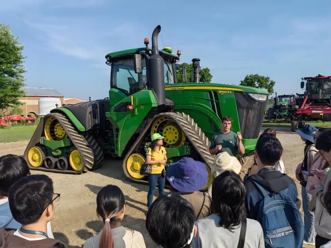 为全面了解美国农业产业体系,师生一同前往了Eric Voisinet's farm和Bumbleberry Farm。农场负责人Eric Voisinet向大家展示了高度机械化的玉米种植作业,师生们参观了配备自动驾驶系统的联合收割机、精准播种设备以及现代化的谷物烘干储存系统。在Bumbleberry Farm,基地负责人带领大家参观了蓝莓从生长培育到成熟收获再到加工成品进行包装的全流程。不少同学表示,这两个农场虽然产品不同,但都体现了现代农业的三个关键特征:机械化、智能化和金融化。这种从田间到市场的全链条实地学习,让他们对农业产业链有了更立体的认识。