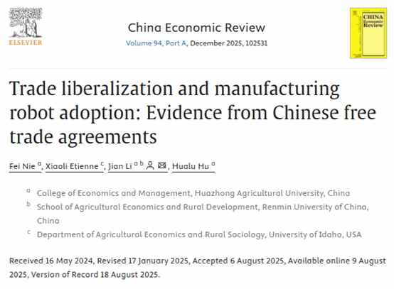 由公司聂飞副教授(第一作者)、李剑教授(通讯作者)、硕士研究生胡华璐与美国爱达荷大学 Xiaoli Etienne 合作撰写的学术论文“Trade liberalization and manufacturing robot adoption: Evidence from Chinese free trade agreements”近日发表于经济学权威期刊“China Economic Review”。“China Economic Review”(SSCI Q1,IF=5.5)是一本专注于中国经济研究的国际学术期刊,致力于发表有关中国经济发展、政策与市场等方面的高质量研究成果,在国际经济学界具有较高的学术声誉与广泛影响力。