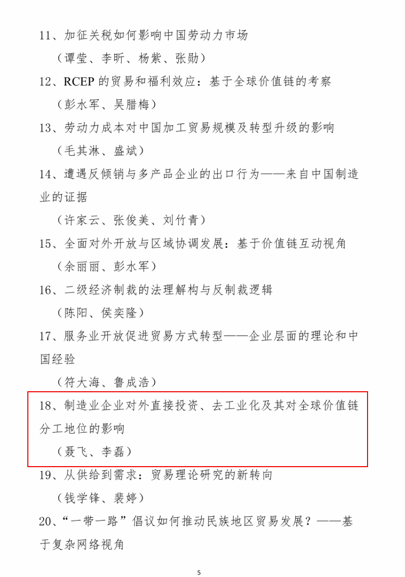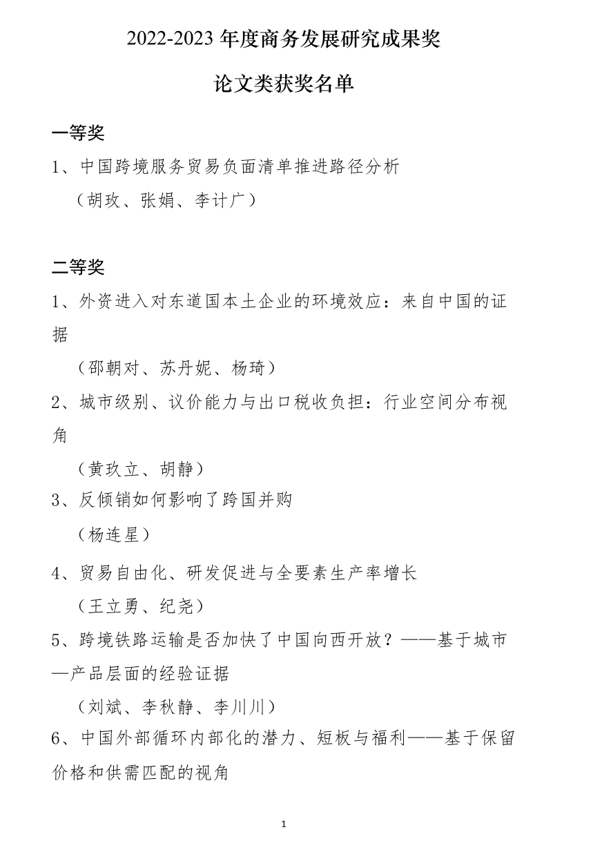 近日,商务部2022-2023年度商务发展研究成果奖评选结果揭晓,公司聂飞与合作者李磊申报的《制造业企业对外直接投资、去工业化及其对全球价值链分工地位的影响》获论文类优秀奖。