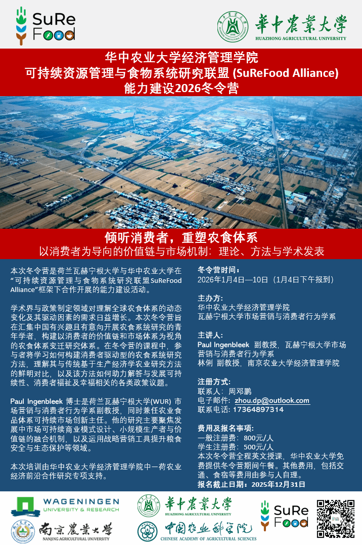 在数字经济时代,学术界与政策制定领域对理解全球农食体系的动态变化及其驱动因素的需求日益增长,“以消费者为导向”已从市场营销口号转变为价值链重构的核心原则,并深度重塑了市场机制的运行方式。这一转变标志着农食系统商业逻辑也已经从“生产什么就卖什么”到“消费者需要什么就生产什么”的根本性变革。本次冬令营旨在汇集中国有兴趣且有意向开展农食系统研究的青年学者,构建以消费者的价值链和市场体系为视角的农食体系变迁研究体系。在冬令营的课程中,参与者将学习如何构建消费者驱动型的农食系统研究方法,理解其与传统基于生产经济学农业研究方法的鲜明对比,以及该方法如何助力解答与发展可持续性、消费者福祉及幸福相关的各类政策议题。