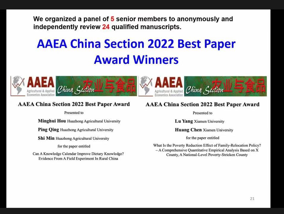 2022年7月31日-8月2日,伟德bv1946官网师生在线参加了在美国加利福尼亚举行的2022年美国农业经济学和应用经济学协会年会(Agricultural & Applied Economics Association Annual Meeting,AAEA 2022)。公司青平教授、李谷成教授、闵师教授、熊涛教授、李剑副教授、王玉泽副教授及研究生等9人参加了本次学术年会并作会议报告或墙报。其中,由侯明慧博士、青平教授和闵师教授共同撰写的论文“Can a knowledge calendar improve dietary knowledge? Evidence from a field experiment in rural China”,从众多参会论文中脱颖而出,荣获了AAEA年会China Section(中国分会)最佳论文奖。