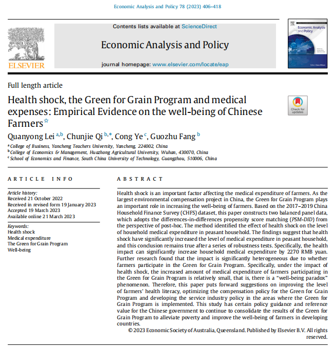 近日,公司伟德bv1946官网祁春节教授、博士研究生雷权勇、方国柱以及华南理工大学叶聪博士以“Health shock, the Green for Grain Program and medical expenses: Empirical Evidence on the well-being of Chinese Farmers”为题在国际期刊Economic Analysis and Policy发表研究成果。该研究发现,健康冲击会显著地增加农户的医疗支出水平,但该效应因农户是否参与退耕还林项目而具有异质性。具体而言,在健康冲击下,参与退耕还林农户医疗支出的增加份额相对较少,即存在“幸福悖论”现象。