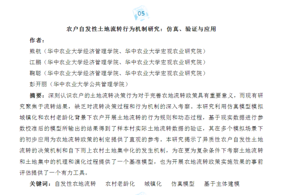 近日,公司伟德bv1946官网农业产业与技术经济团队熊航教授和公共管理公司彭开丽教授团队在经管类权威期刊《管理世界》2023年第6期上发表题为“农户自发性土地流转行为机制研究:仿真、验证与应用”的研究成果。