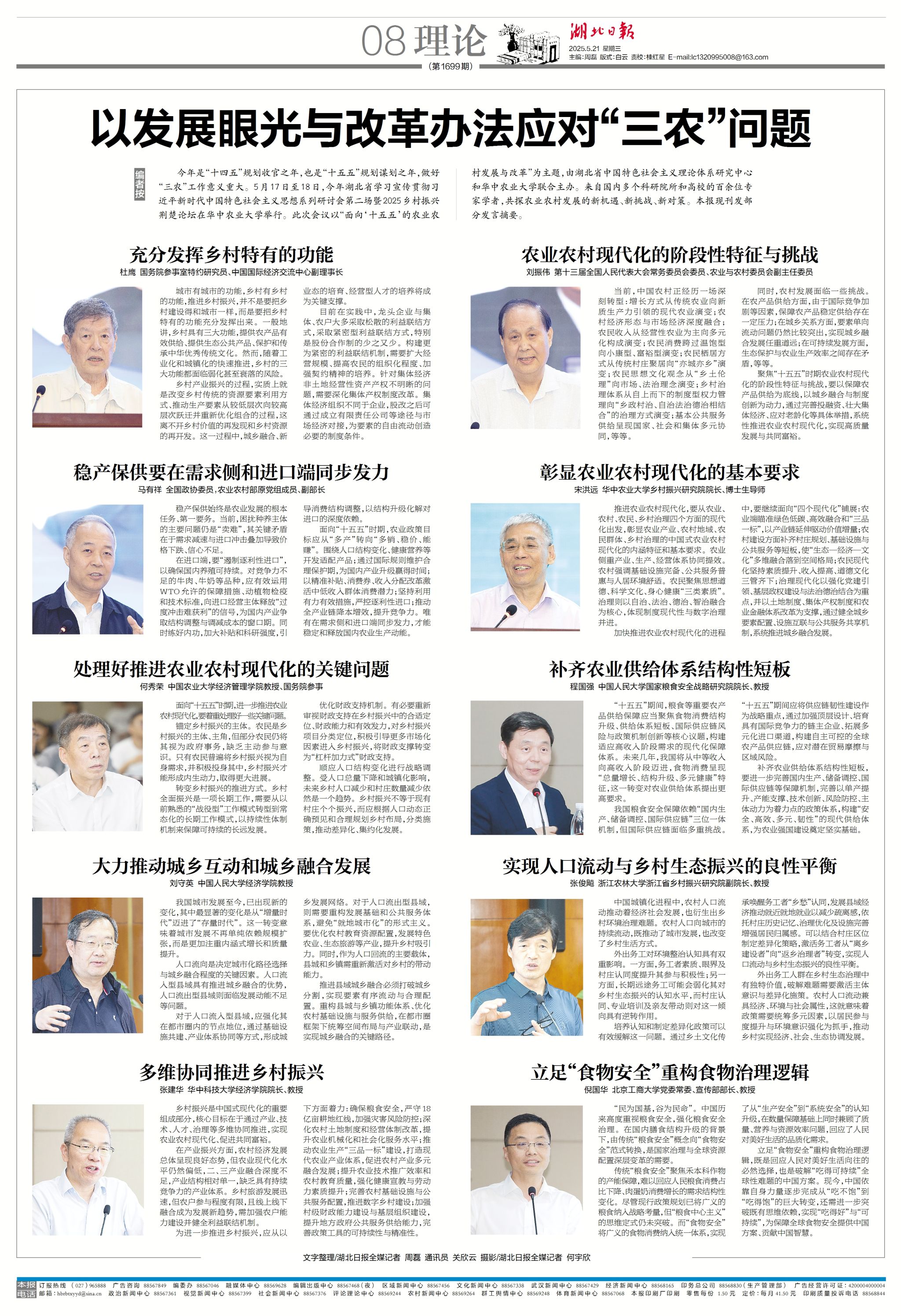 今年是“十四五”规划收官之年,也是“十五五”规划谋划之年,做好“三农”工作意义重大。5月17日至18日,今年湖北省学习宣传贯彻习近平新时代中国特色社会主义思想系列研讨会第二场暨2025乡村振兴荆楚论坛在bv伟德国际1946举行。此次会议以“面向‘十五五’的农业农村发展与改革”为主题,由湖北省中国特色社会主义理论体系研究中心和bv伟德国际1946联合主办。来自国内多个科研院所和高校的百余位专家学者,共探农业农村发展的新机遇、新挑战、新对策。本报现刊发部分发言摘要。