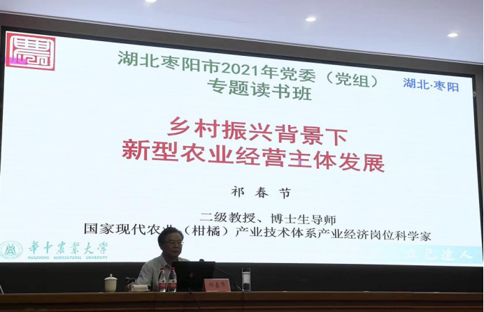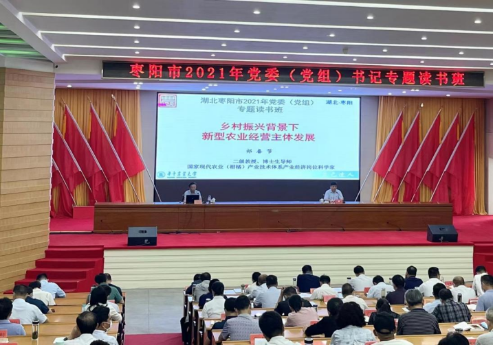 2021年是“十四五”规划的开局之年,也是枣阳市推动产业横向成群、纵向成链,抢抓发展机遇的关键一年。为深入学习习近平新时代中国特色社会主义思想,坚决贯彻党的十九届五中全会精神,切实提升把握新发展阶段、贯彻新发展理念、服务构建新发展格局的能力和水平,为“十四五”开好局、起好步奠定坚实基础,枣阳市举办了此次党委(党组)书记专题读书班。祁春节教授应邀围绕《乡村振兴战略下新型农业经营主体发展》这一主题作专题培训。
