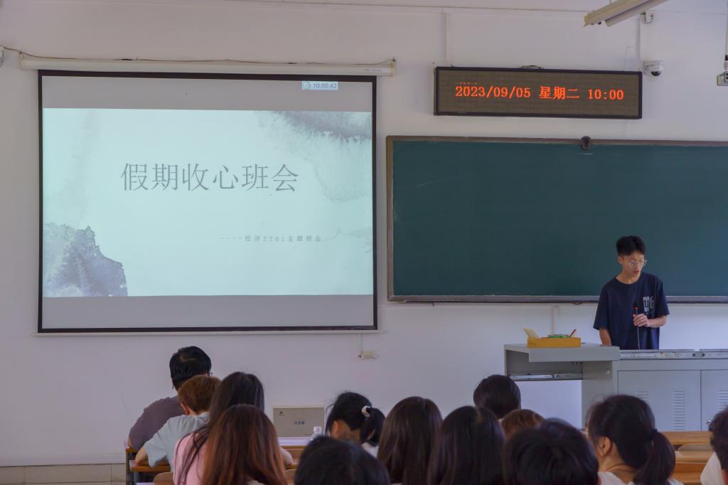 在经济2103班班会上,班主任罗晓峰从健康成长和安全学习两方面进行班会分享。他结合暑期自身工作和以往经历讲述校园用车的规范问题,要求同学们文明驾车,安全出行;他强调要增强网络安全意识,列举身边的诈骗手段和事例,提醒同学们警惕电信诈骗,做到“三不”,即未知链接不点击、陌生来电不轻信、个人信息不透露。同时,面对大三新阶段,他用“机会是留给有准备的人”来勉励同学们,希望大家找准目标方向,打好课业基础,用心迎接大学新阶段。