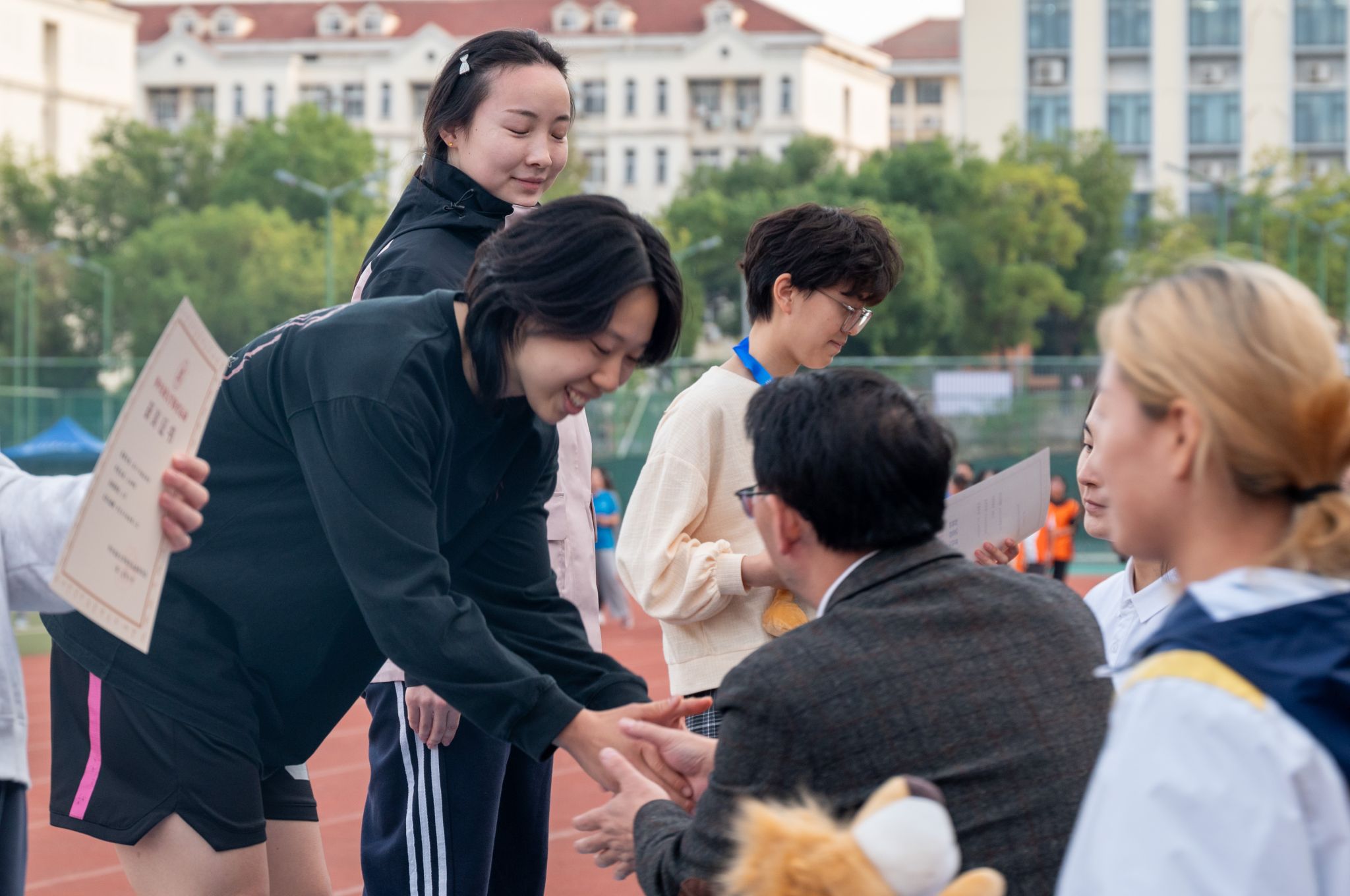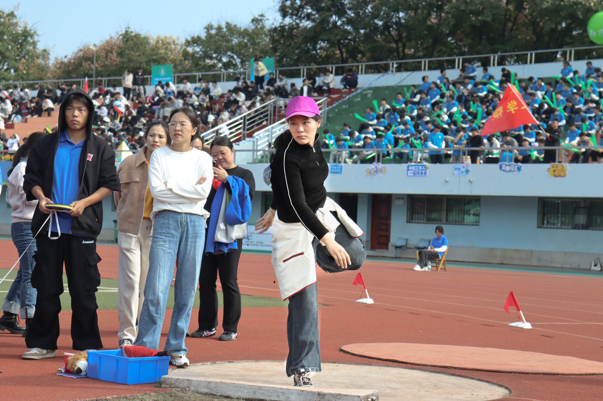 在教工组女子实心球前抛比赛中,2025级本科生辅导员李俊真双手持球后摆至极限,重心完全落于后脚;随着起身发力,腹部紧绷带动手臂前推,实心球在空中划过流畅弧线后稳稳落地,最终一举夺得第三名。谈及投掷感受,她笑着把那一瞬间幽默形容为“释放压力”——好像所有积压的烦恼与压力,都随实心球的飞出被一并抛开。领奖台上,她目光望向看台,对着为自己助威的同学们轻轻比心;这份双向的热情与集体凝聚力,让她格外动容。她既是赛场上奋力拼搏的选手,也是看台下始终为大家热情鼓劲的人,更是同学们身边真挚可靠的伙伴。