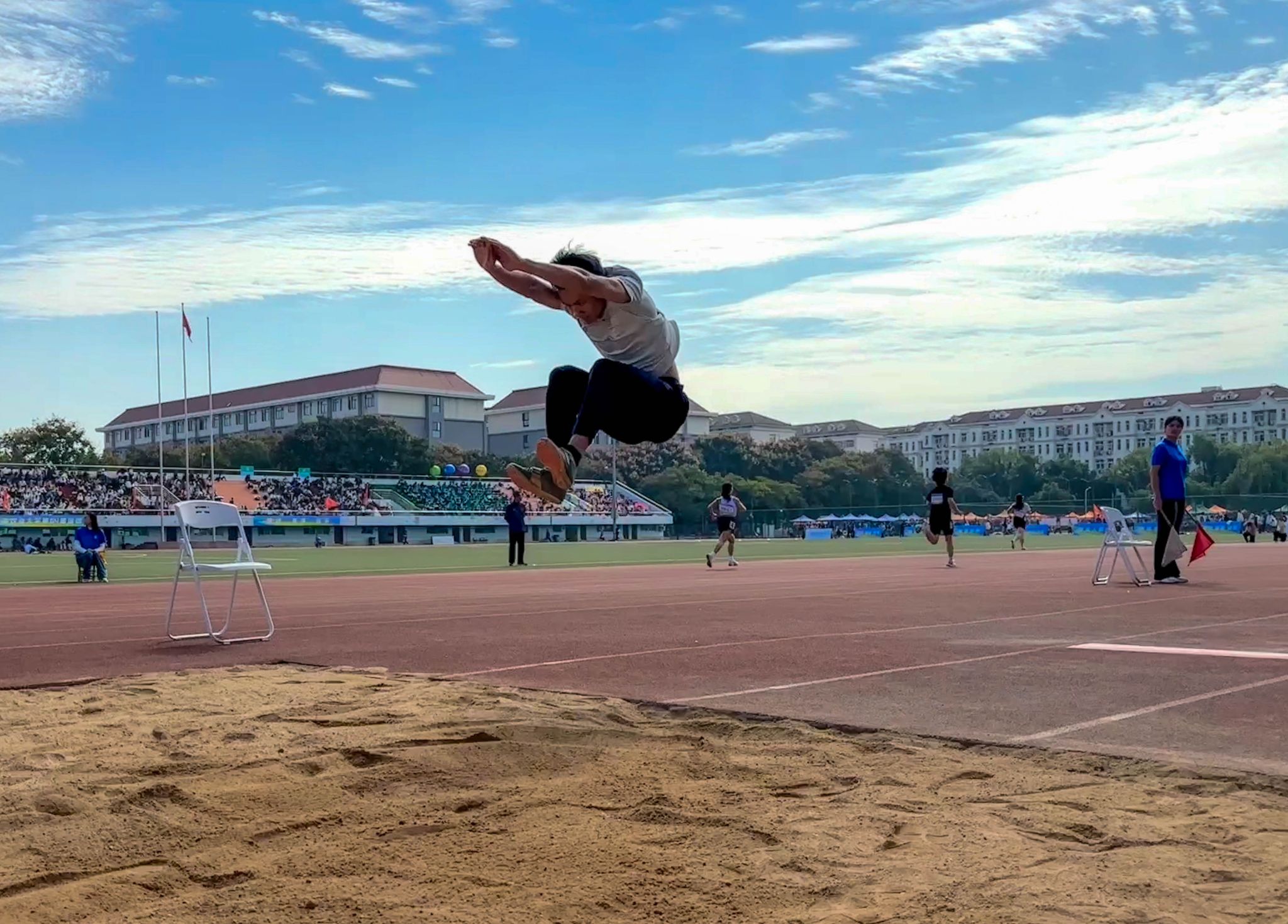 三级跳远的沙坑前,工管2201班的杨伯江目光专注而坚定。助跑、加速、单脚跳、跨步跳、跳跃——三个环节的衔接在瞬间完成,身影在空中划出连贯的弧线,最终从容摘得银牌。作为经验丰富的老将,杨伯江分享了自己的运动体悟:“三级跳远的关键在运动员腿部动作的衔接,它决定了力量能否流畅传递。”从追求卫冕到享受过程,这块银牌见证了他从从执着于“赢”到读懂运动本质的蜕变成长。