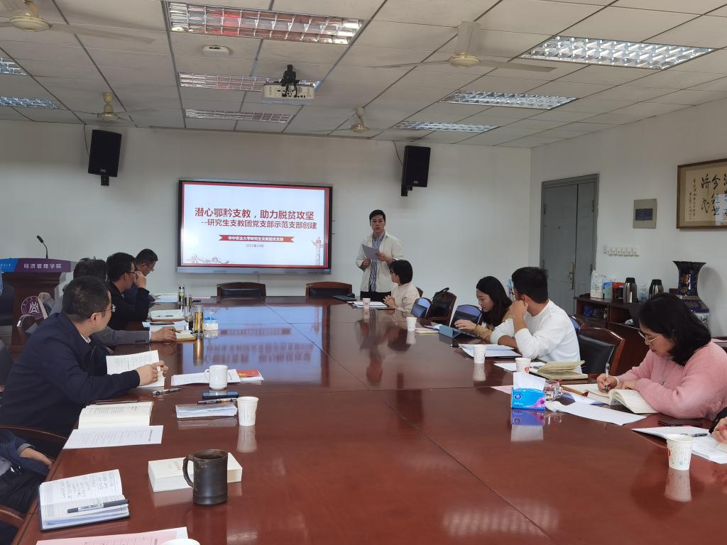 农经系教工党支部书记杨志海对标“七个有力”,从“常抓理论武装、深化实践教育,强化制度建设、发挥表率作用,严抓党风教风、筑牢风险防控,立足中心工作、党建业务融合,强化协同联动、注重引领实效,守好思想阵地、落实立德树人,密切联系师生、实现优质供给”等七个方面,总结了支部在创建“三个三”党建工作新模式方面的突出成效。经济学系教工党支部副书记毛海欧聚焦思想政治工作质量创优情况,分享了支部在社会实践与服务员工中践行课程思政理念,以课程思政建设为主线提升支部组织活动时效性的有益经验。