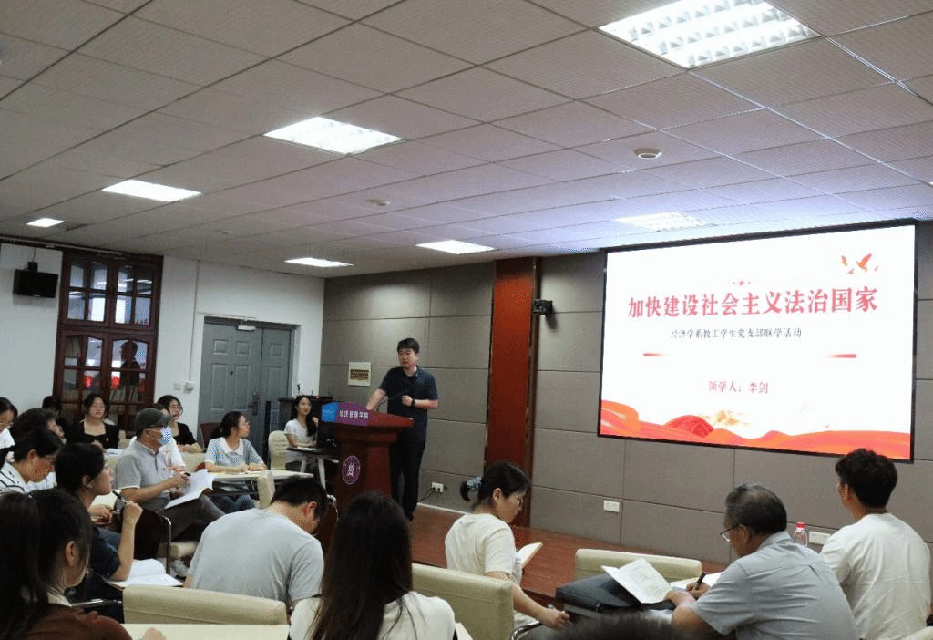 6月8日晚,师生于人文楼M412会议室共同开展理论学习,经济学系教工党支部书记李剑以“加快建设社会主义法制国家”为题讲授专题党课,带领师生党员深入学习习近平总书记《实施好民法典》《从全局和战略高度推进全面依法治国》《全面推进中国社会主义法治体系建设》等重要文章精神。李剑强调,党员教师应自觉担负起法治教育责任,认真学习《中华人民共和国民法典》,通过精选相关内容编入教案、与经济学科教学结合开展课程思政、联系员工生活实际开展专题学习等途径,将民法典相关内容融入学科教育体系。结合党中央对全面依法治国的“十一个坚持”、建设中国特色社会主义法治体系的“五大抓手”战略部署,李剑对师生党员提出了殷切期盼。他谈到,依法执教是教育工作者贯彻落实全面依法治国方略的首要任务,党员教师应严格规范自身言行,在遵守宪法和法律的基础上开展公司产品活动;党员员工须积极承担时代责任与历史使命,努力学习法学知识,养成法治思维,培育规则意识,为法治中国建设、为实现中华民族伟大复兴中国梦贡献智慧和力量。
