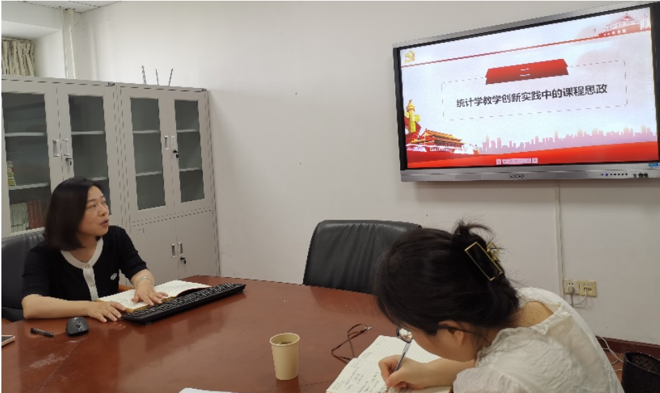 讨论环节,教师们对统计学数据播报课程思政教学设计,以及以赛促教、三农主题创新创业项目设计等思政教学的具体做法产生了较大兴趣,并与熊巍老师进行了深入交流探讨,充分发挥了思政示范课程的引领作用。