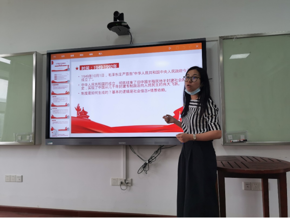 活动伊始,张露老师领学《中国共产党简史》第五至七章和《陈宝生部长在部党组理论中心集体学习研讨扩大会暨直属机关党史学习教育专题读书班结业式上的讲话》(以下简称《讲话》)。她基于“社会信念+情景依赖”的制度生成逻辑,分析了新中国成立以来我国社会制度、土地制度、统销统购制度的变迁史,深刻论证了社会主义根本制度是我国在曲折中前行的根本动力与保障,应该遵循客观规律,分时期、分阶段和分步骤地进行社会主义建设。她指出,陈宝生部长的《讲话》指导我们应该从党的百年光辉历程中汲取力量、寻找智慧,增强“四个意识”、坚定“四个自信”、做到“两个维护”,并深刻感悟教育的初心使命。