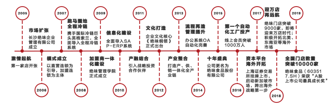绝味食品股份有限公司(以下简称“公司”)成立于2005415日,公司业务覆盖全国30个省级市场,初步覆盖香港地区以及新加坡、加拿大等海外市场,并建立起全面覆盖长江流域、珠江流域、黄河流域、松花江流域的20多个大型食品加工生产基地,门店总数超过10000家,员工超4000人,销售规模超过40亿元。2017317日,在上海证券交易所上市(股票代码:603517) 。